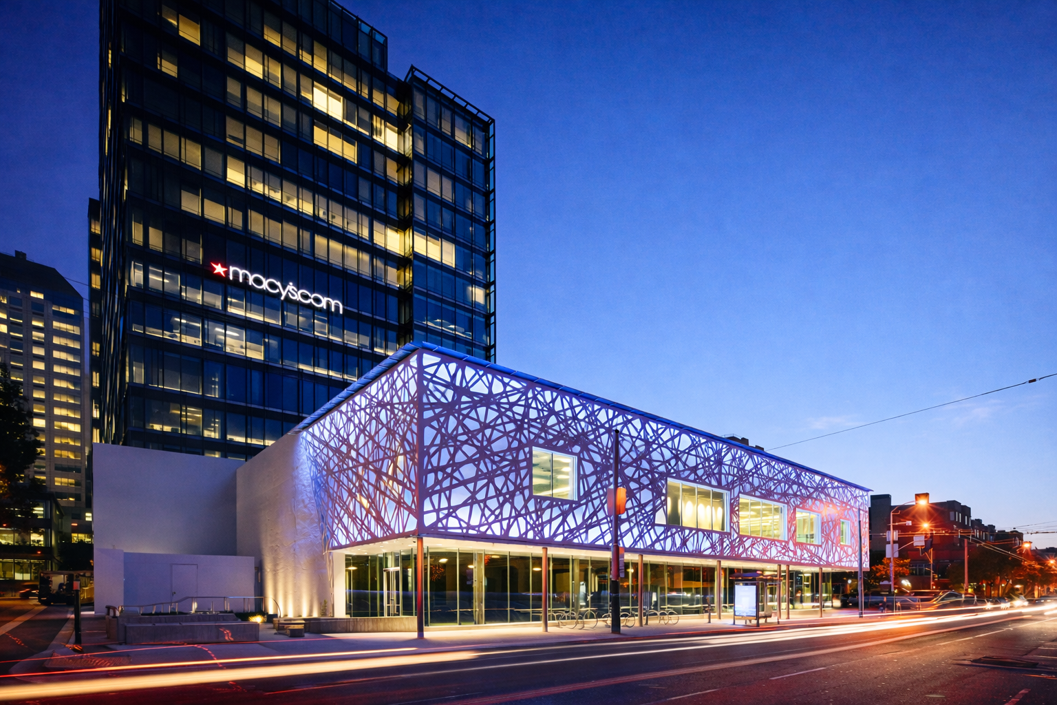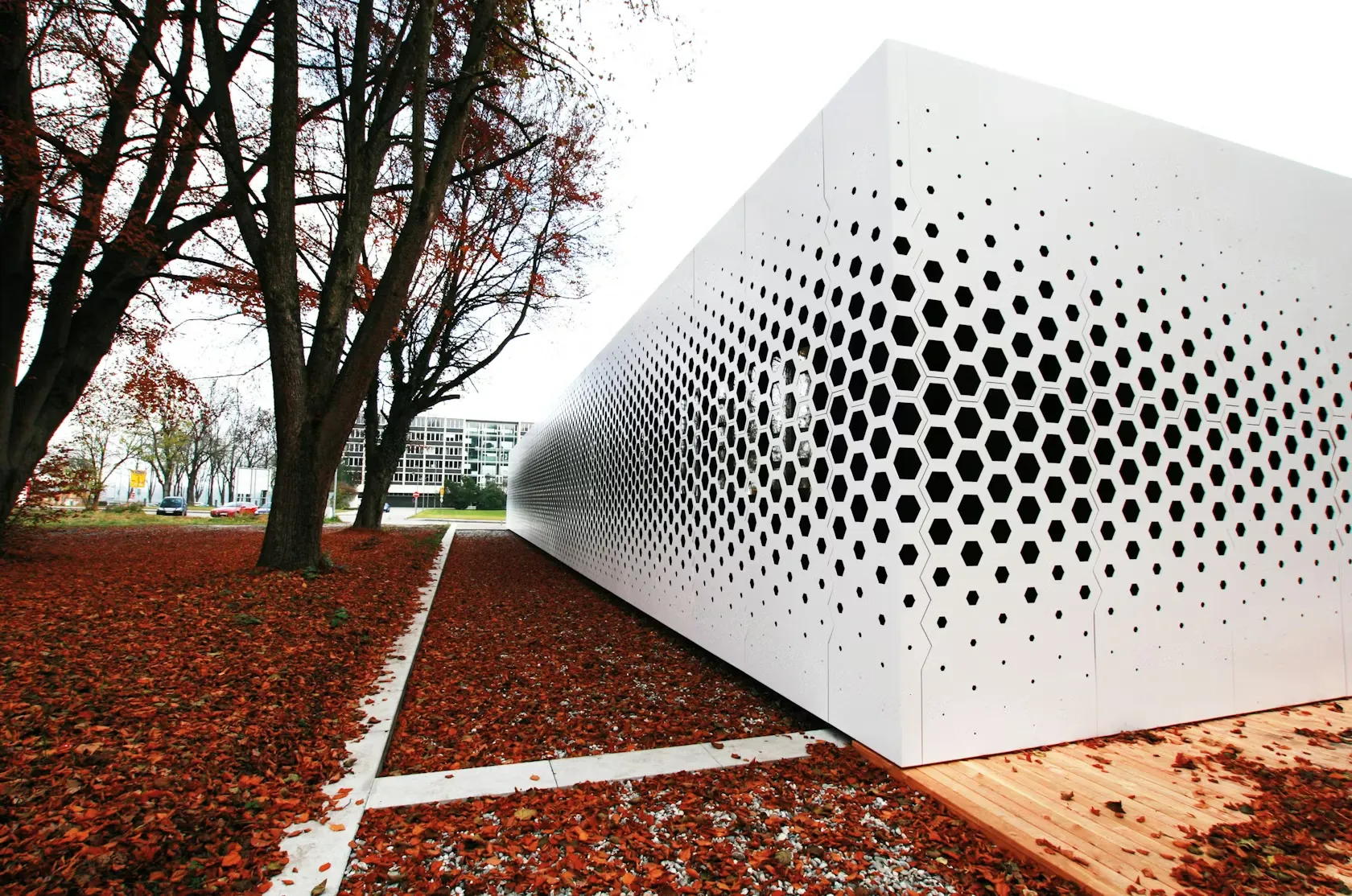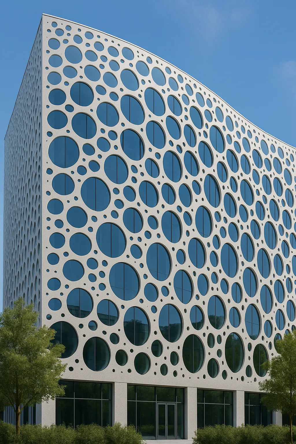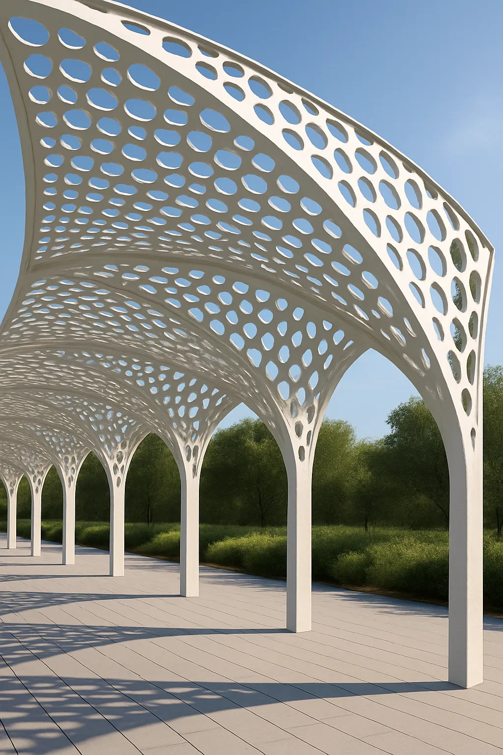 Painéis leves, perfurados e curvados, criando sombra dinâmica, luz modulada e ambientes exteriores confortáveis..