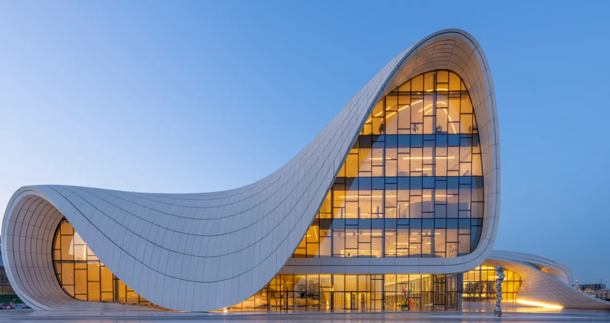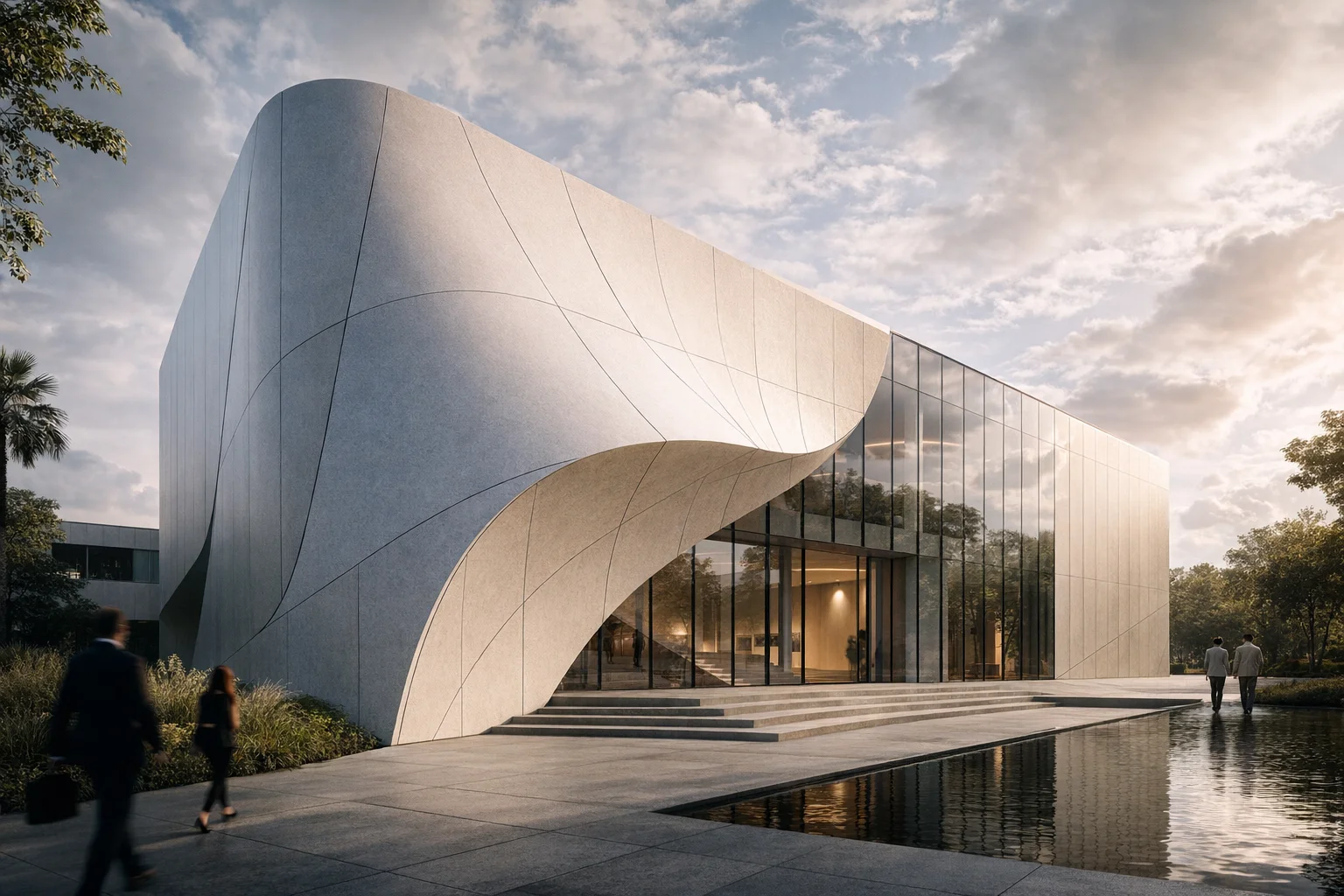 Superfícies leves aplicadas a edifícios, capazes de assumir geometrias contínuas, ondulações suaves e formas expressivas.