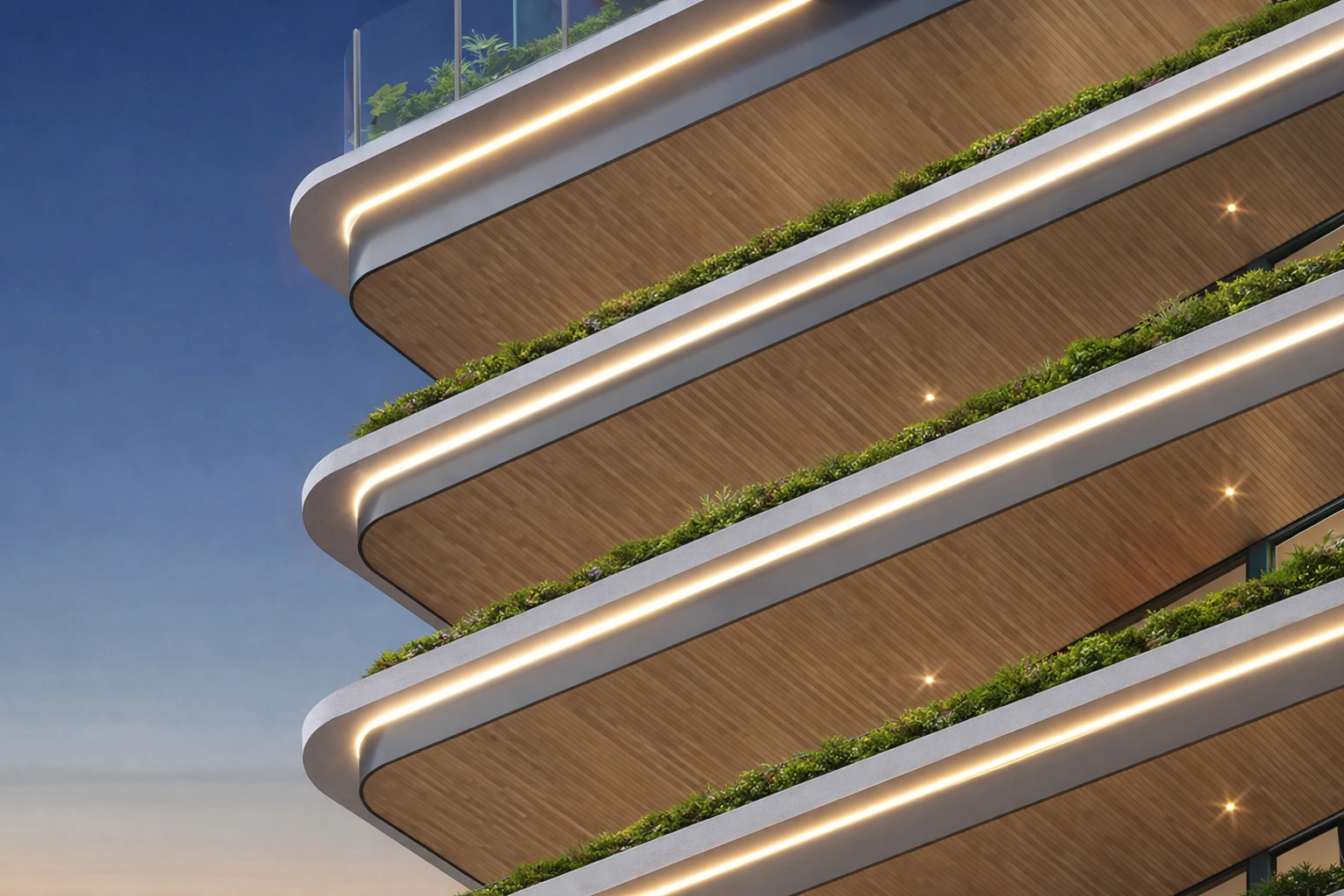 Sistema em compósito técnico para definição de bordos de laje, varandas, coroamentos e transições curvas de fachada.
